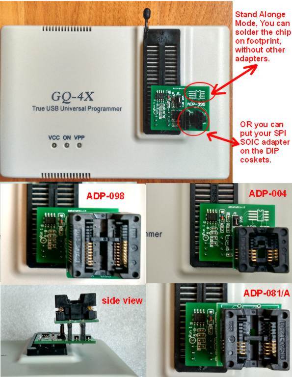 It can be used on any standard SPI DIP adapters, chips. Such as ADP-004, ADP-081,ADP-081A, ADP-098 etc.