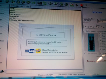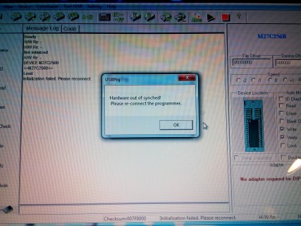 I have a Willem programmer GQ-3X since august 2010 and worked good until yesterday. I read eprom M27C256B, i've removed the IC from the socket and the USB. After a while i wanted to read another eprom and the software remained freeze, i've removed the usb and tried again, the same thing. After a few minutes USBPrg returned the error "Hardware out of sync! Please re-connect the programmer.". I did that and still the same problem.