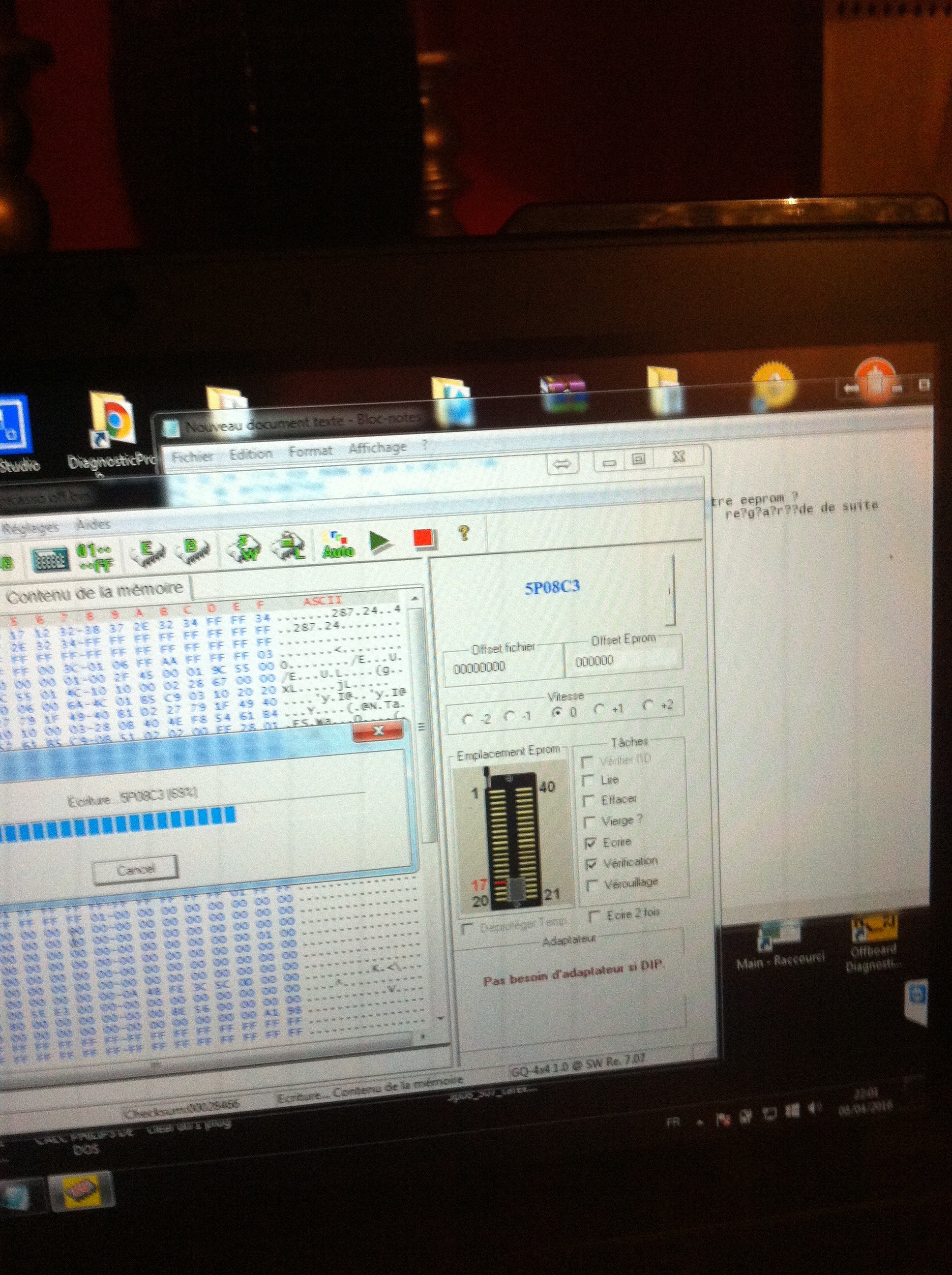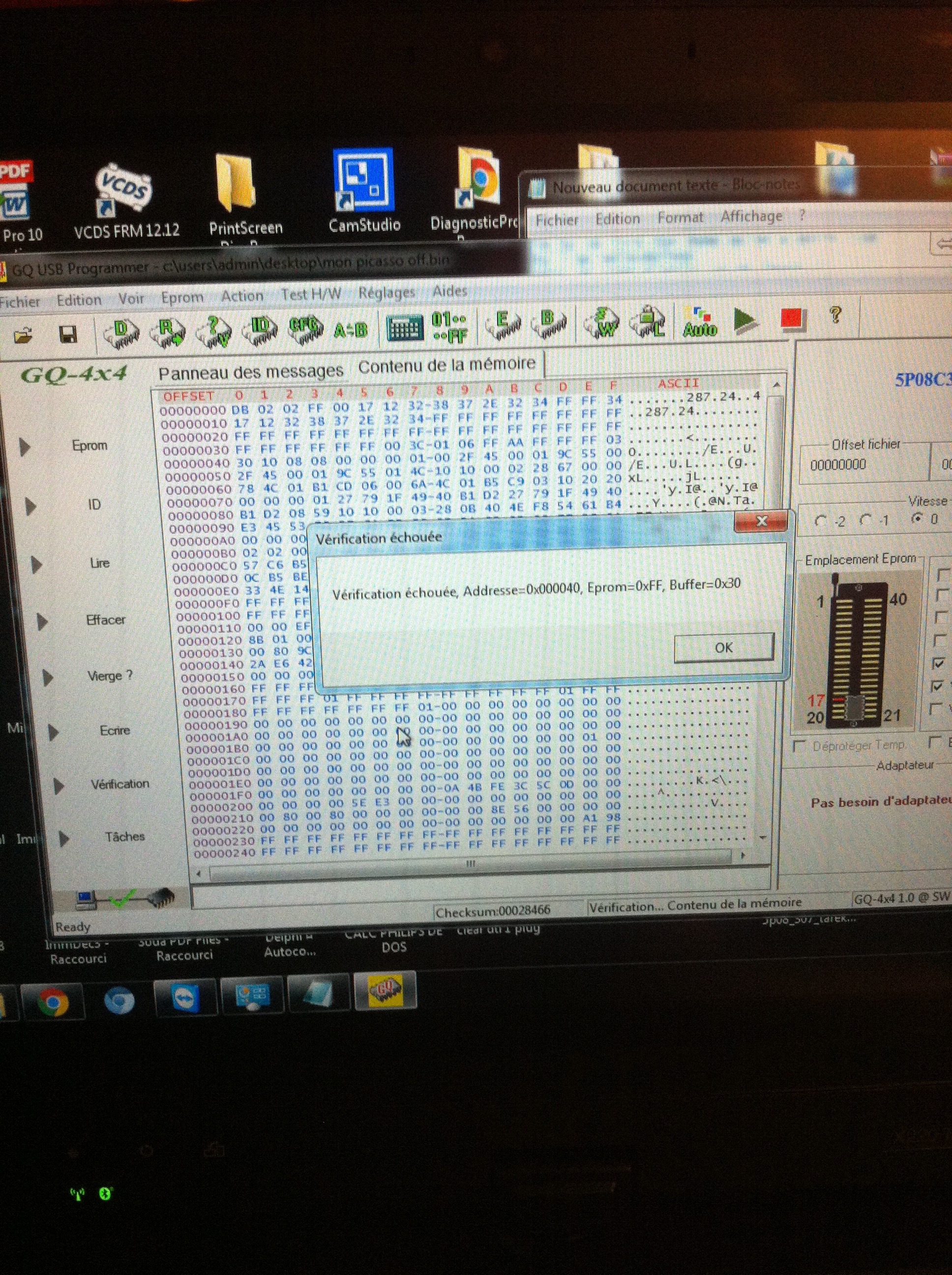 Bonjour à tous je viens vers vous cars je n'arrive pas a lire une 5P08C3 avec mon programateur GQ4X V4 acheter ici que sa soit la lecture ou l'ecriture sa ne se fait pas correctement et j'ai un message d'erreur essayer a plusieurs reprise , j'ai bien installer le drivers 3.0 puis installer le soft 7..; pour ma version mes rien ni fait pouvez vous m'aidez s'il vous plait