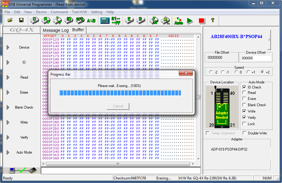 Recently I got problem: original GQ-4X can read and verify 28f400 w/o problems, but when I try to erase the flash, it comes to 100% and the software hangs up with programmer's all 3 LEDs ON. Software update to the newest and computer change did not help.