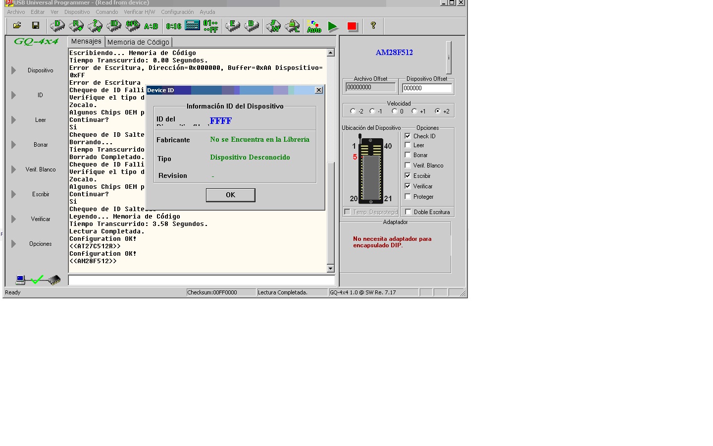 Hi guys i get my Gq 4 recently, and i testing it whit a eeprom AM28F512, the issue i have i cant read the ID chip, and i cant program the chip, i try whit two new eeprom (retired of the blister) and same.