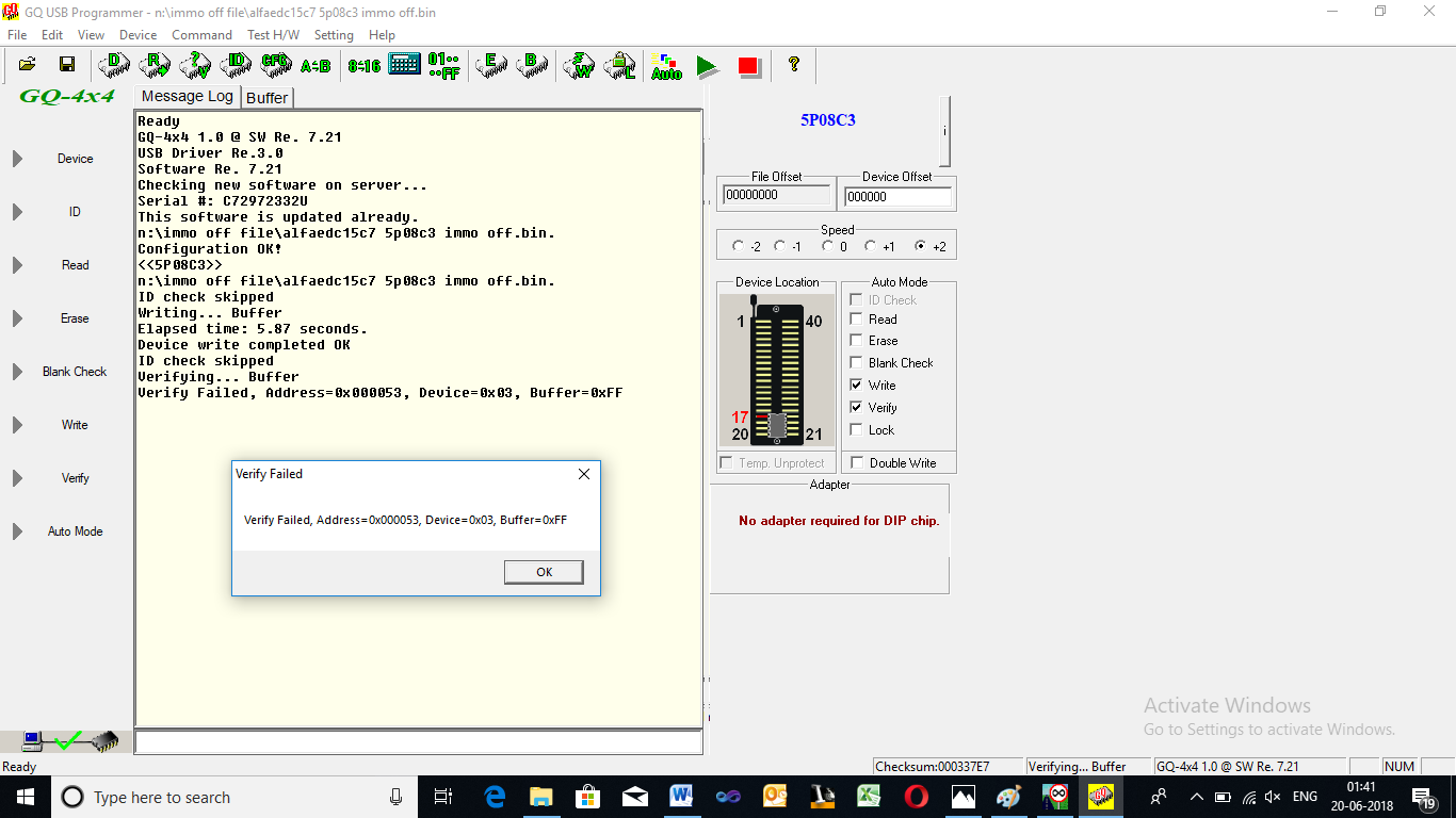 Hi, i recently purchased an GQ-4x4 updated the software and usb drivers. i am able to read the 5P08C3 eeprom data. but unable to write.i get the below mention error. Device write complete ok ID check Skipped verifying... Buffer Verfify Failed, Address = 0x00053, device = 0x03, Buffer = 0xff I have attached the screen shoot of the same waiting for your reply Regards Dayananda.T
