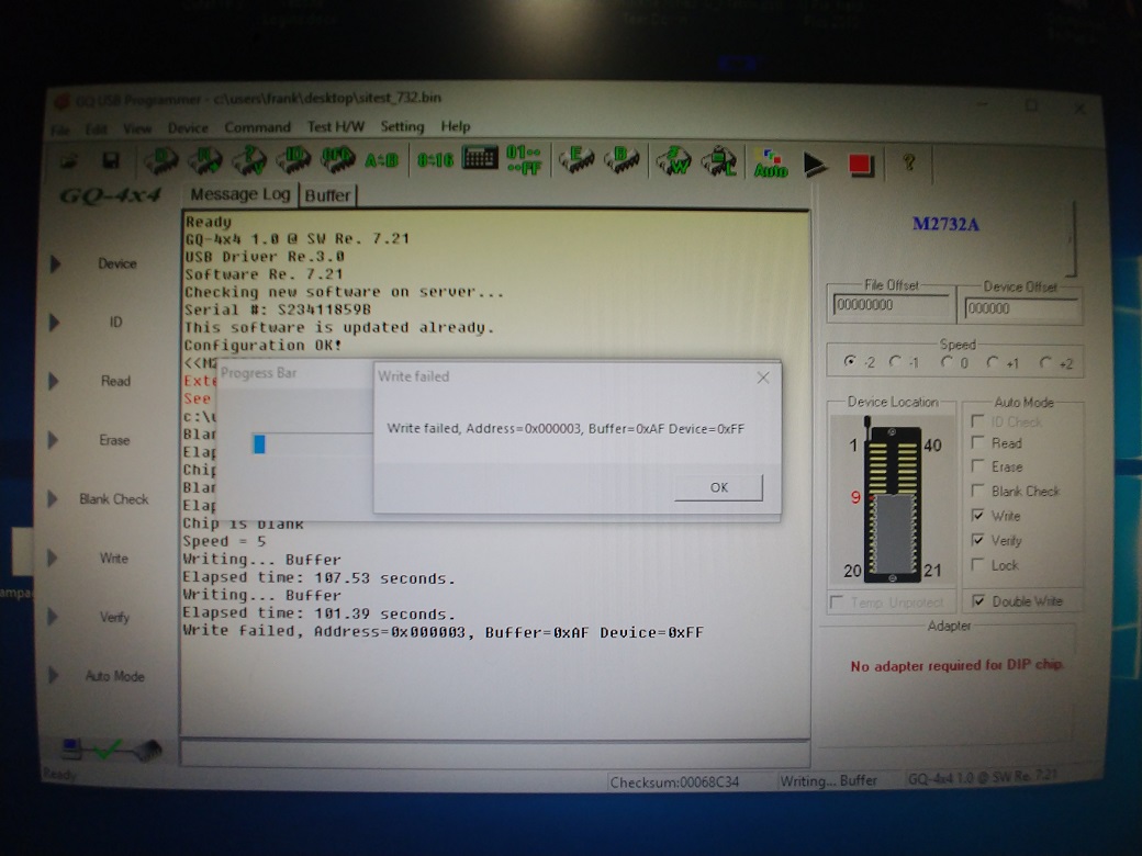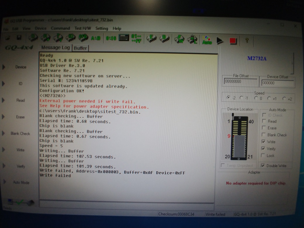 I have a GQ-4x4 and an external power supply 9v 600ma. I plug in the external power supply and get a green power led and then plug in the usb cable. I have tried device M2732A and 2732A. I have tried both of these on 10 different M2732A-2F1 chips. I get the same error when trying to write on each chip. The chips are blank checked twice before writing. The error I get is: Write failed, Address=0x000000, Buffer-0x00 Device=0xFF